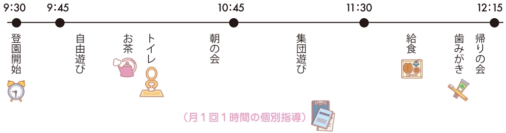 ●3〜5歳児 ●保護者分離 ●週1日、隔週、月1回、午前又は午後通園 ●1グループ10名〜12名